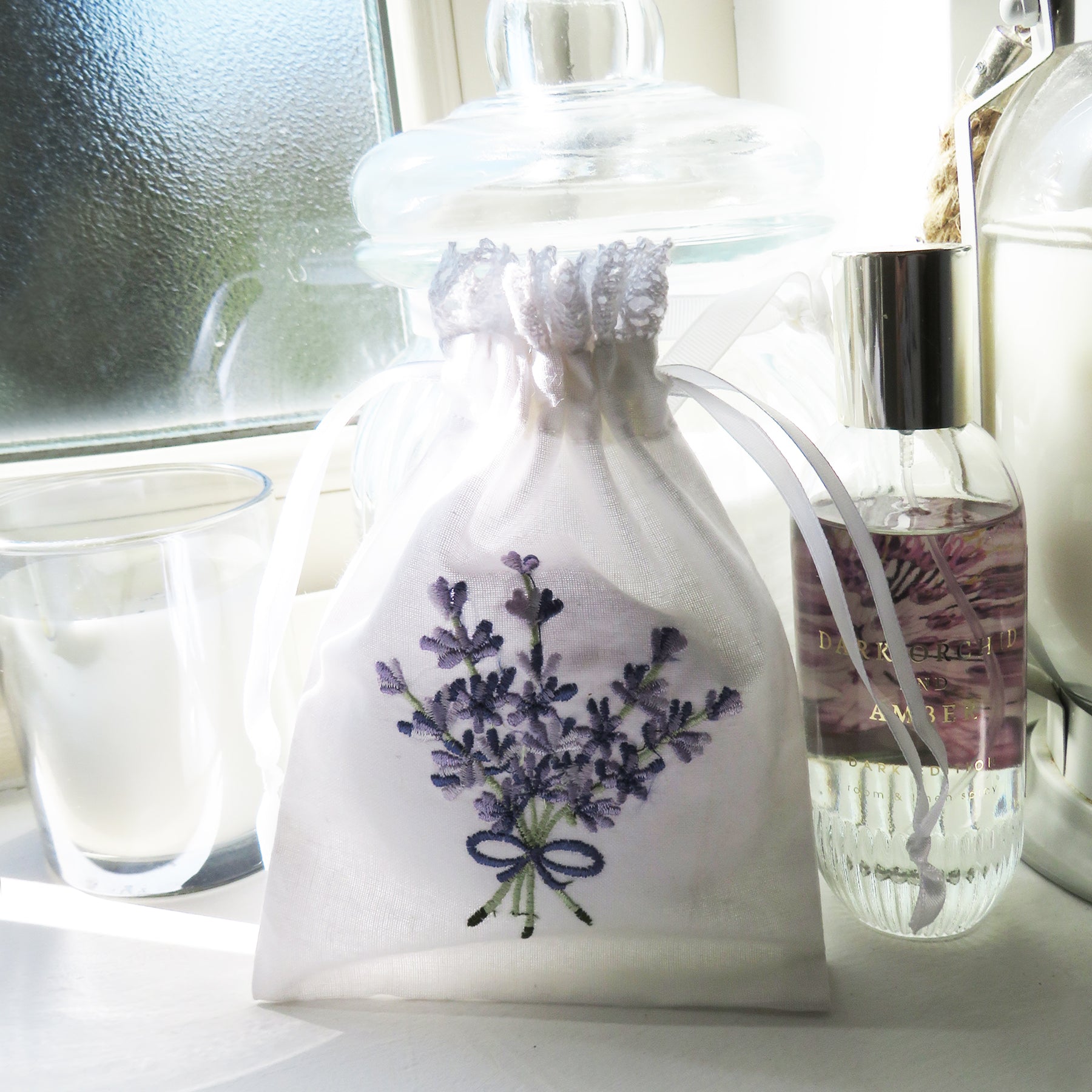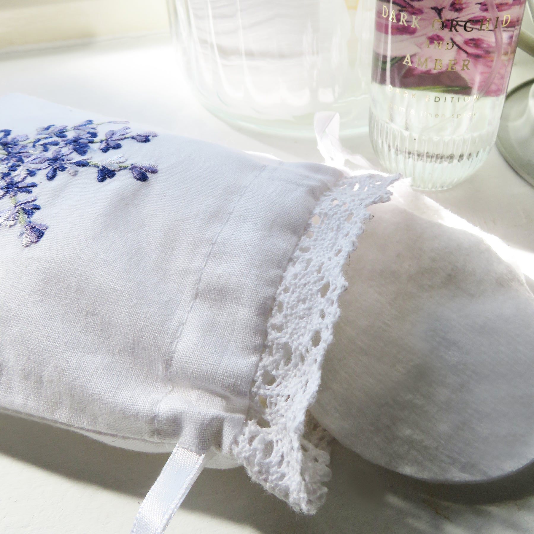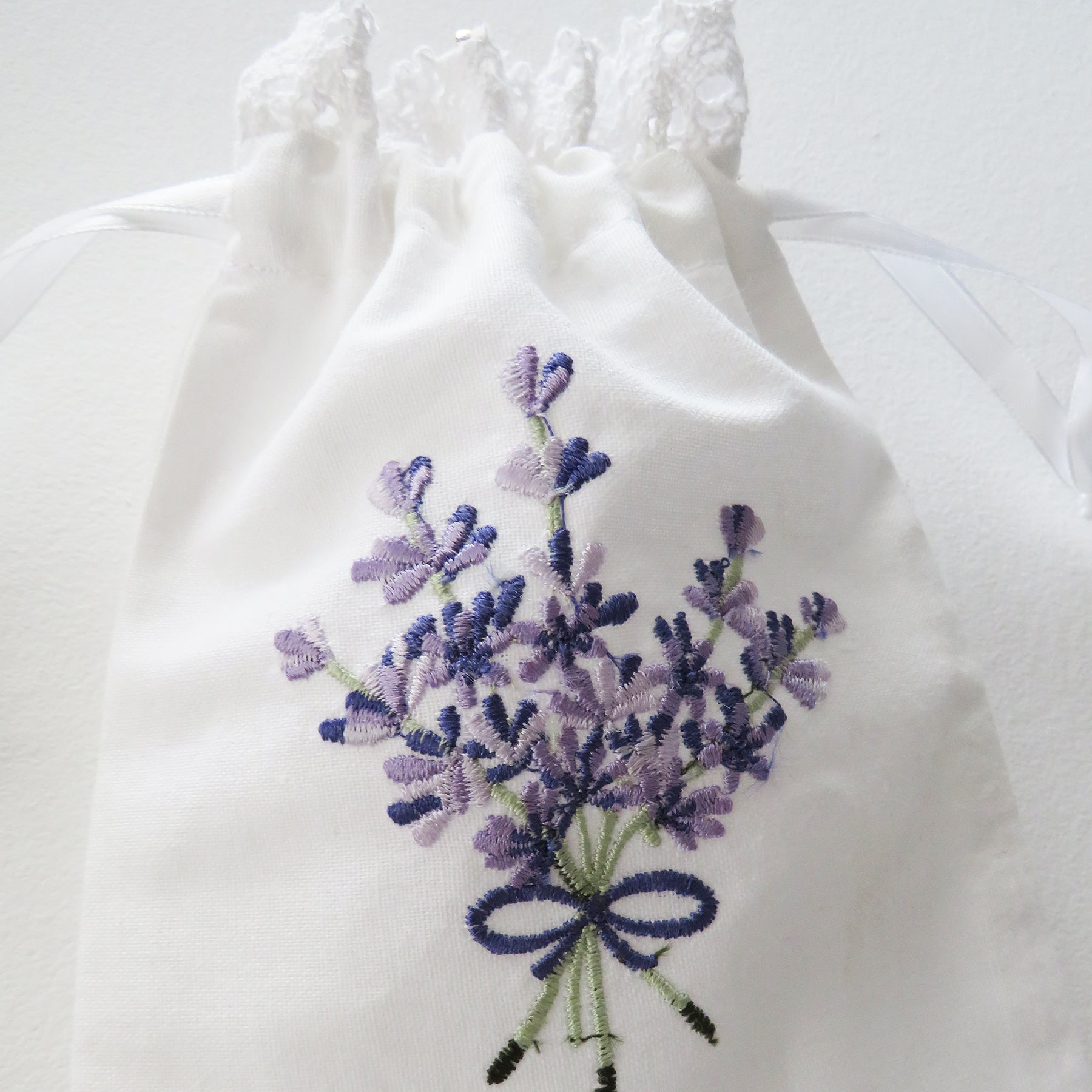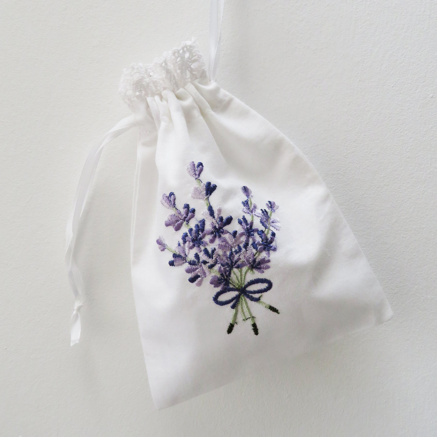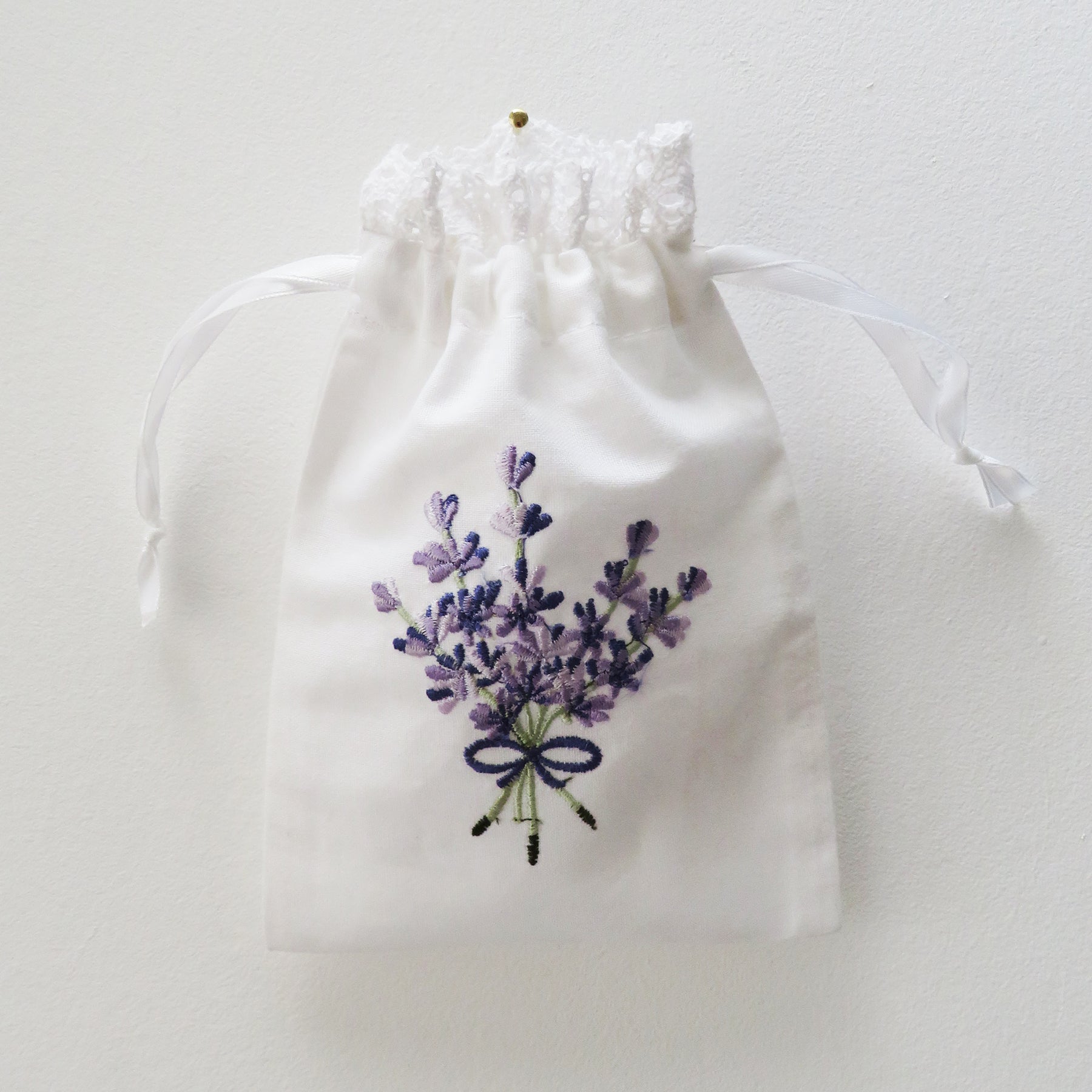 Beautifully crafted with lavender embroidery, this drawstring bag is decorative and practical. Its delicate embroidery, lace details, and neat ribbon ties make it a charming storage solution or gift accessory.