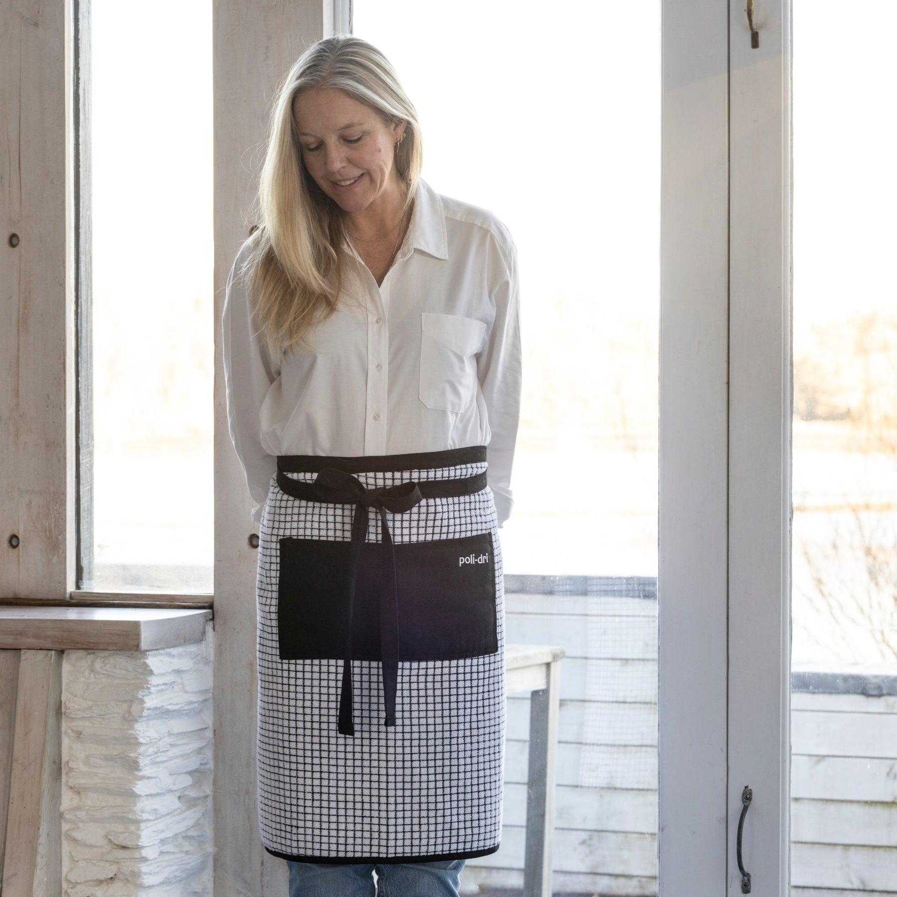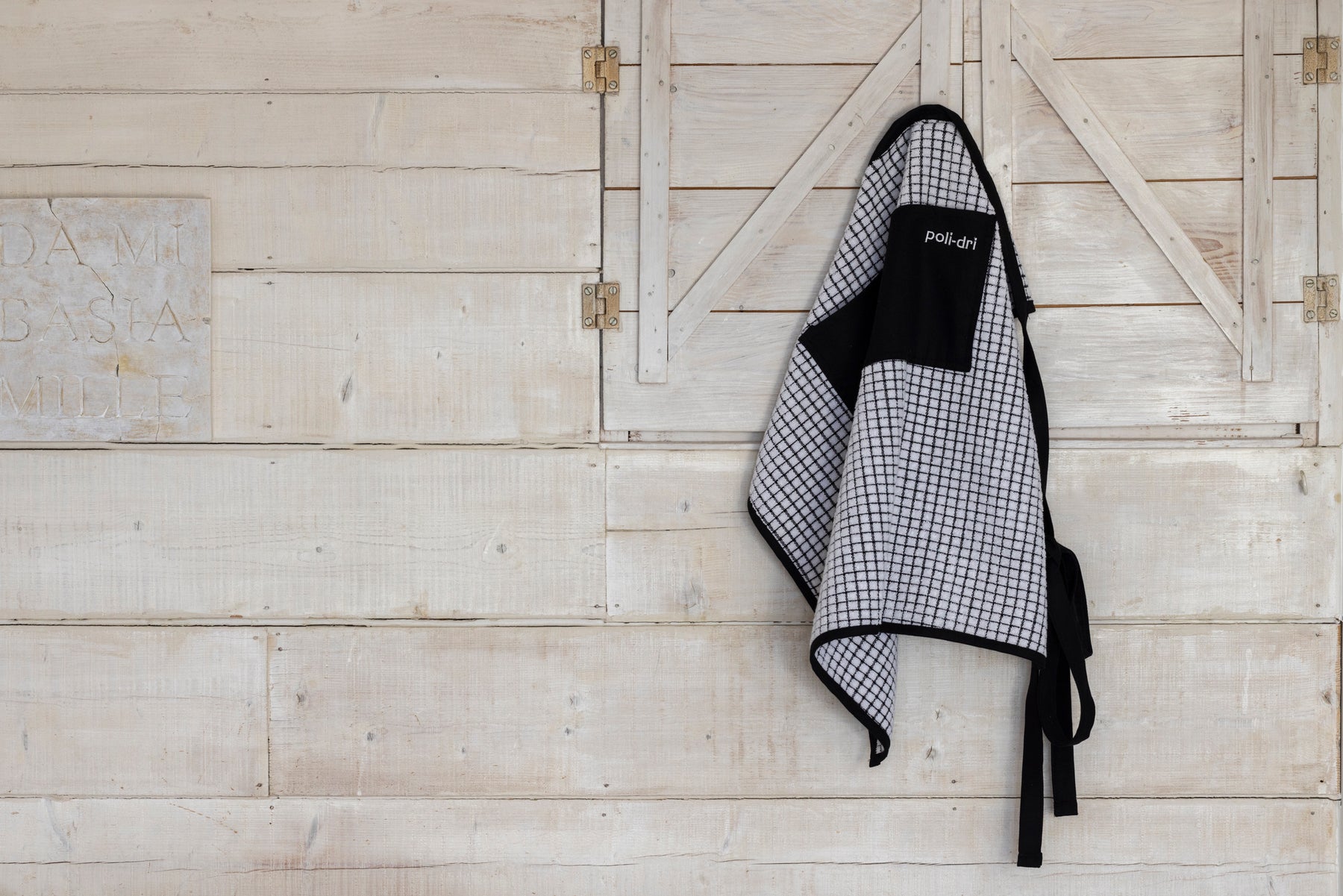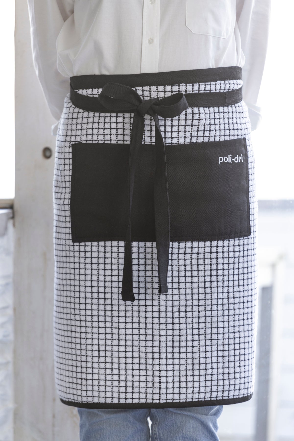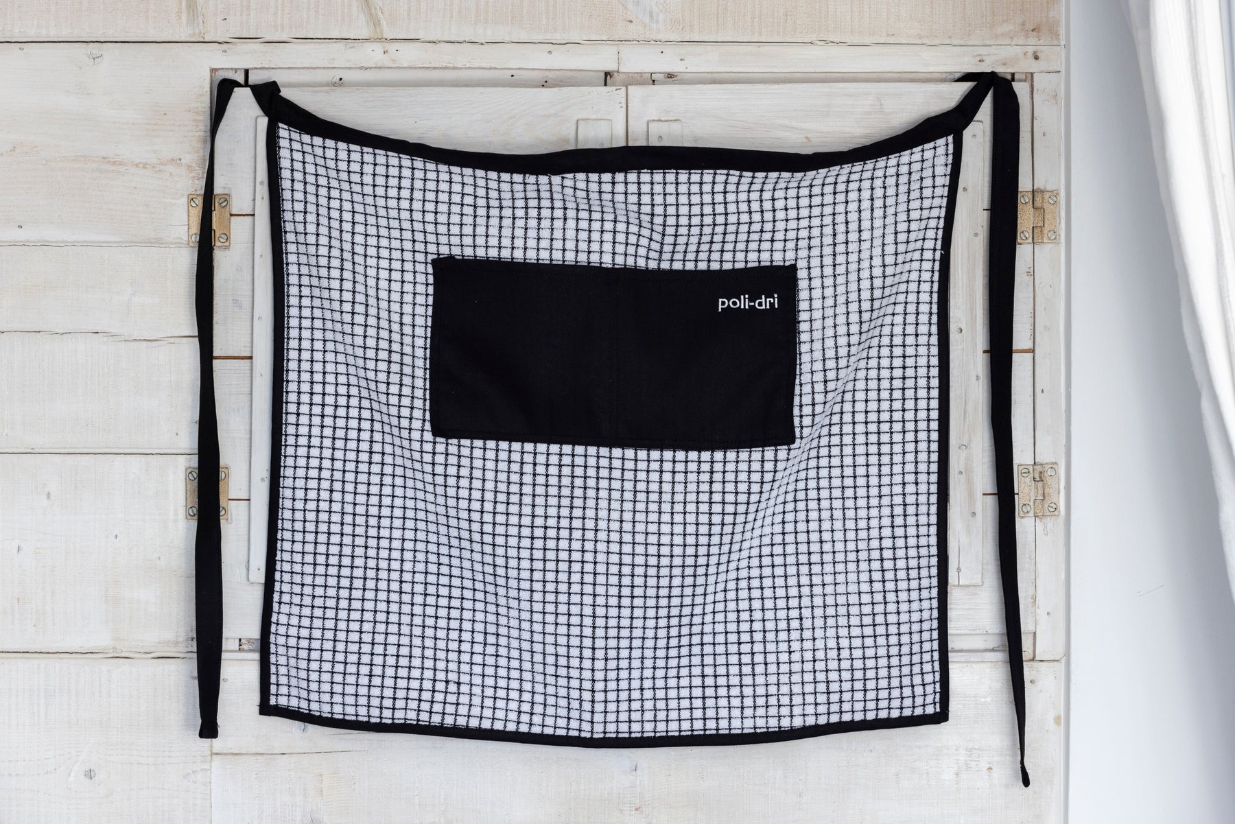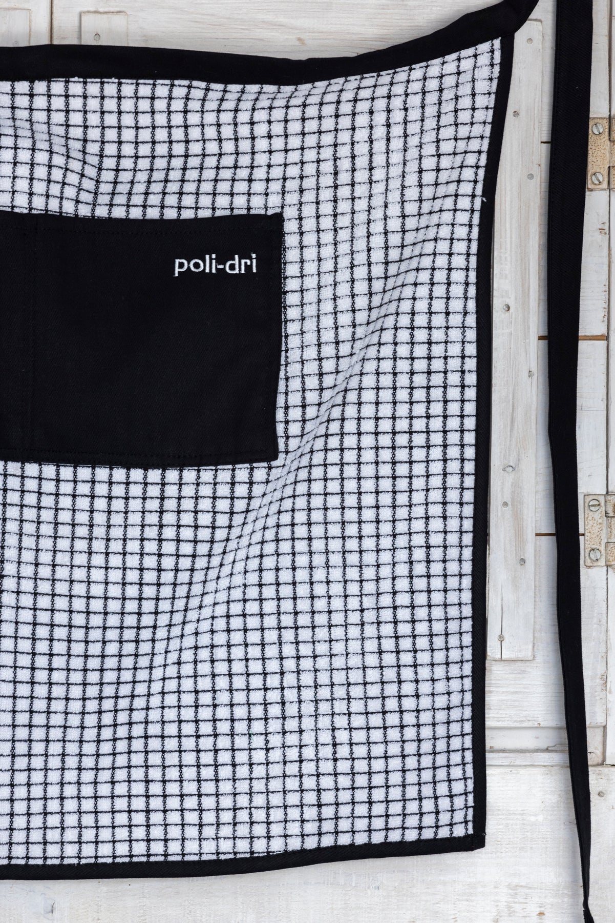 Crafted from the distinctive poli-dri black 100% natural cotton and paired with matching cotton canvas, this apron combines absorbency with a lustrous finish. Fully washable for easy care.