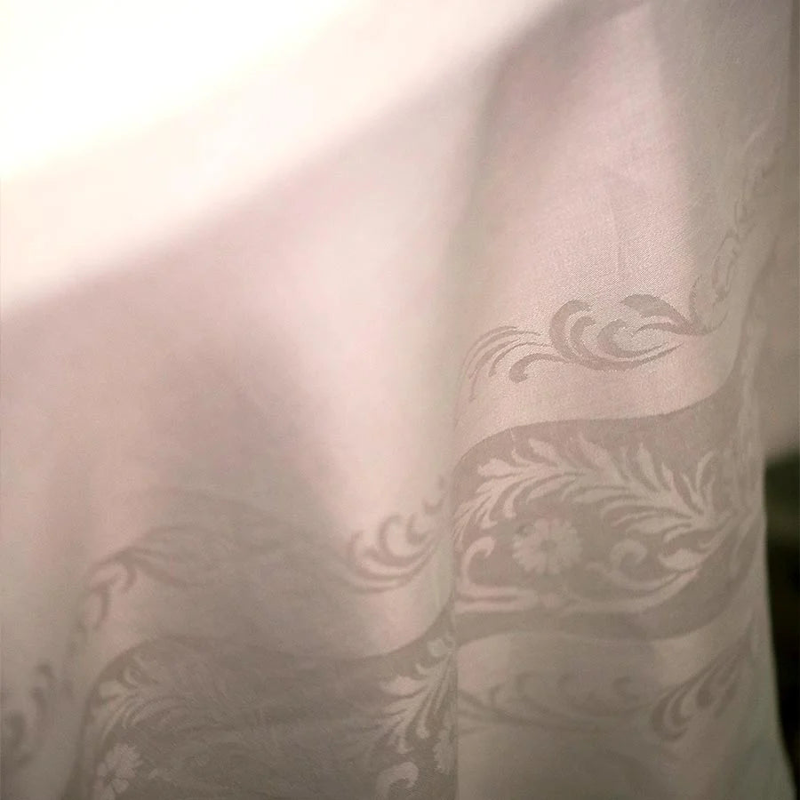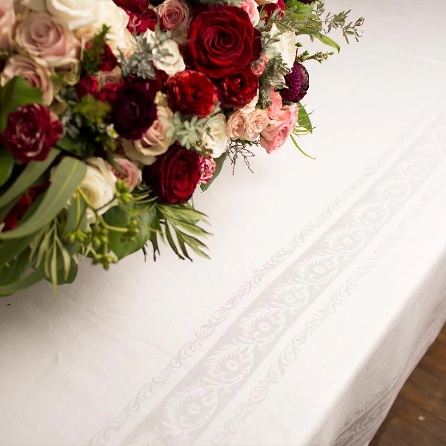 Irish Double Damask linen fabric tablecloths are woven from pure flax yarns in a special manner so that subtle patterns are visible, even in an all-white cloth. This beautiful and subtle detailing adds a touch of elegance to any dining table.