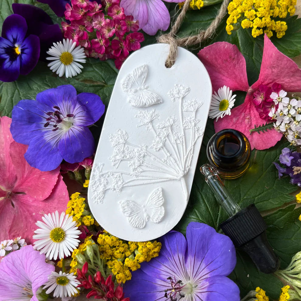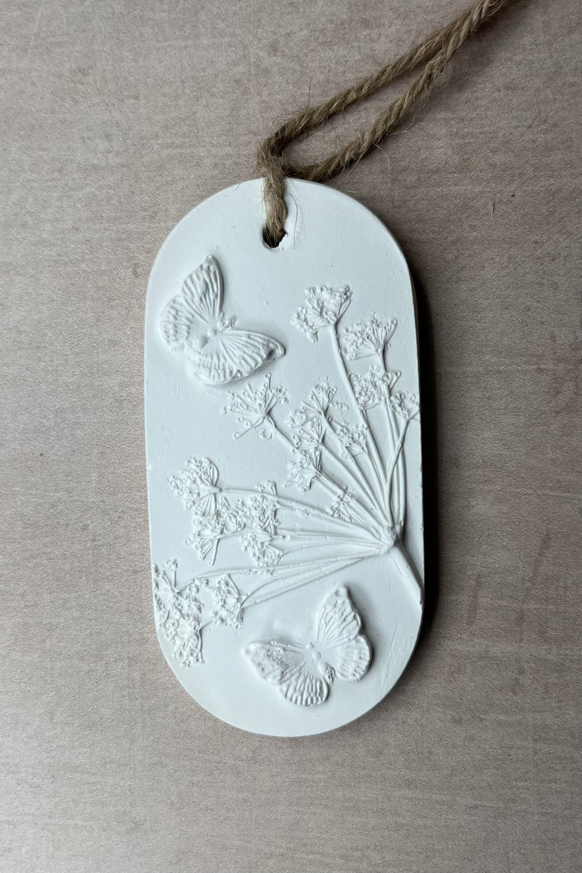 Regular priceHandmade small botanical fragrance diffuser made from a botanical cast taken from a beautiful cow parsley flower collected during the summer, with two pretty butterflies added to the design.